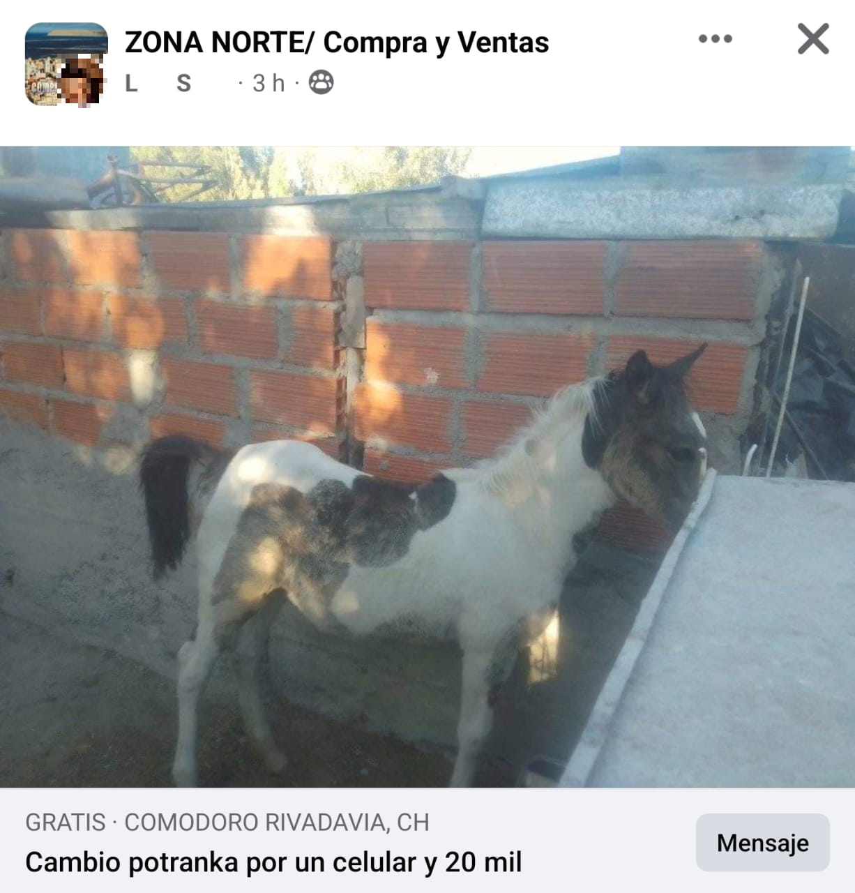 Además de las plataformas de compra y venta online, la red social Facebook acapara gran parte de las ofertas en internet, donde se pueden publicar artículos de una manera más informal. En Comodoro un usuario utilizó la sección “Marketplace” para ofrecer una potranca.