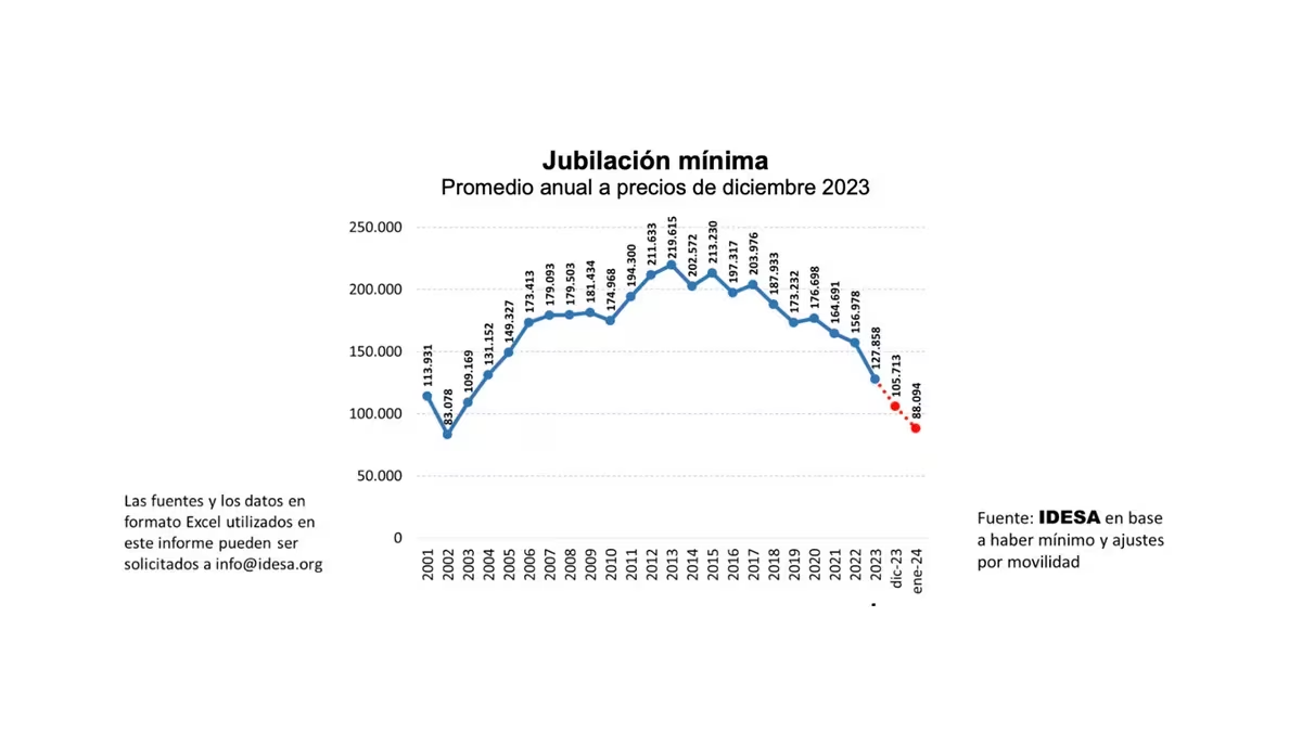 El análisis proyecta que, asumiendo una inflación aproximada del 20% en enero de 2024, el valor real de las jubilaciones en ese mes habría sido equivalente a $88.094 a precios de diciembre de 2023. Esta tendencia sugiere que, para febrero, el valor real de las jubilaciones sería incluso inferior al registrado en el año 2002, marcando el punto más bajo en el siglo XXI. Por debajo incluso de los valores de la última gran crisis económica argentina.
