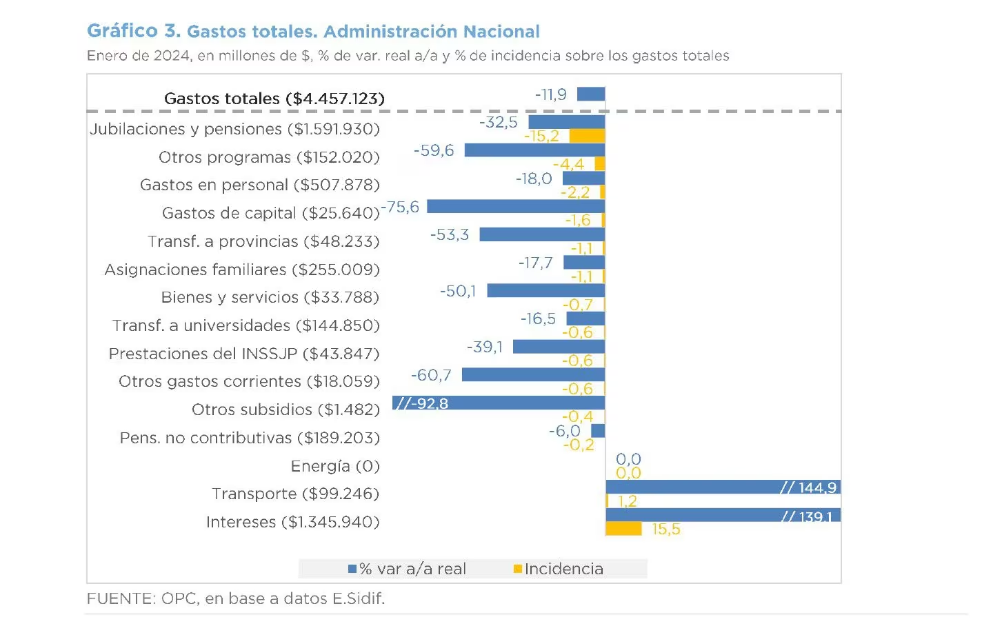 -Los gastos totales de la Administración Nacional registraron una caída real de 11,9% año a año en el primer mes del año y el recorte en los primarios llegó a 30,8% año a año.