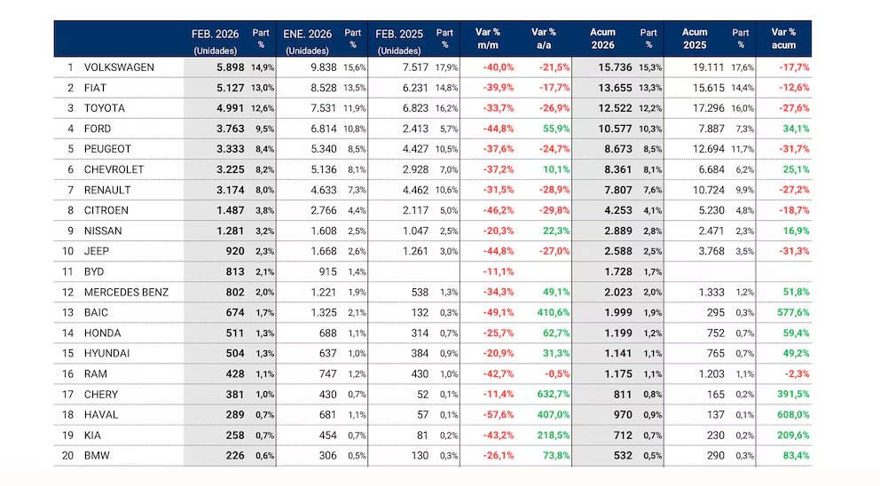 En febrero no se patentaron 24.277 sino 42.026 vehículos, lo que no modifica sustancialmente el nivel de ventas que se había informado. Con este resultado, febrero tuvo una caída intermensual del 36,8% y una baja interanual del 5,7% en la comparación con el mismo mes del año anterior. El acumulado de enero y febrero mantiene una proyección negativa similar a la del primer mes con un 4,9% de retracción respecto a 2025.