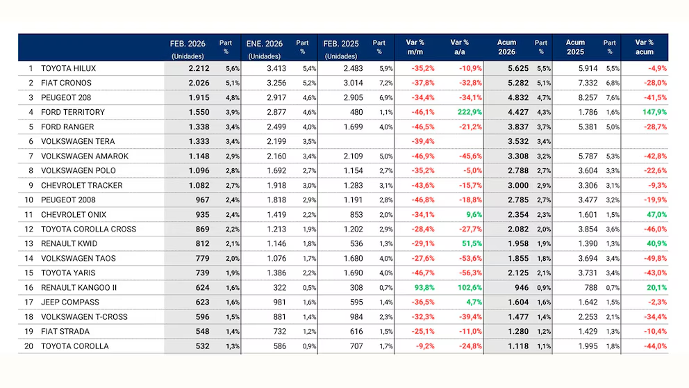 El Ford Territory volvió a quedar entre los 5 modelos más vendidos y el mejor SUV del mercado, alcanzando las 1.550 ventas con la pick-up Ford Ranger en quinto lugar con 1.338. El Volkswagen Tera volvió a “marcar su territorio de 2026″ quedando como el mejor modelo de la marca por segundo mes consecutivo al patentar 1.333 autos, justo por delante de la VW Amarok que finalizó con 1.148 y del VW Polo con 1.096 unidades.