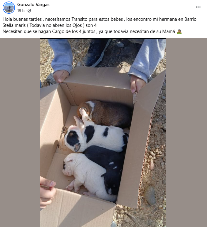 «Necesitamos tránsito para estos cuatro bebés, los encontró mí hermana en el barrio Stella Maris. Todavía no abren los ojos», indicó la persona que los encontró a través de las redes sociales.