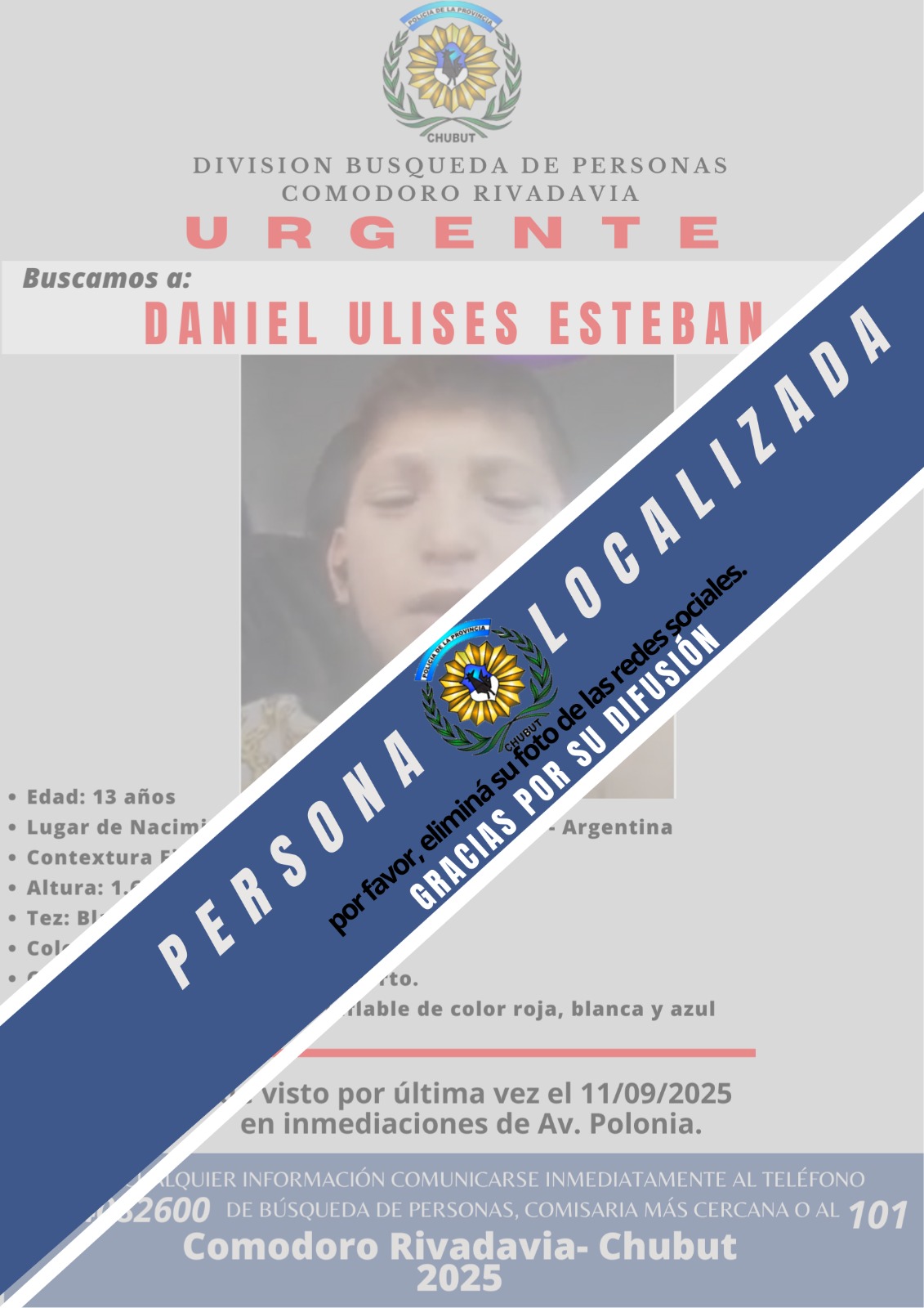 Desde la División Búsqueda de Personas informaron que fue localizado Daniel Ulises Esteban, de 13 años, quien era intensamente buscado.
