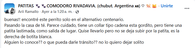 Además, detalló el problema que deriva en su falta de movilidad: «Tiene una patita lastimada, como salida de lugar. Quise llevarlo pero no se deja subir por la patita, es la derecha, de botita blanca».