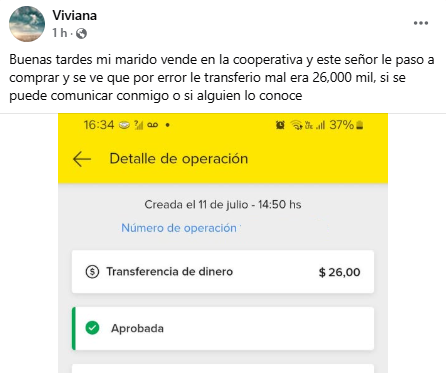 Según contó una mujer, su marido vendió un producto a un hombre que le hizo una transferencia, pero por error o quizás de manera intencional, el pago no fue el correcto.