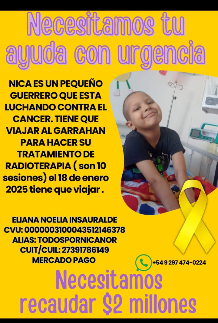 En diálogo con FM La Petrolera 89.3 MHz, explicó: «Es paciente oncológico, tiene 7 años y lo derivan ahora al Garrahan, tiene que hacer 10 sesiones de radioterapia y tenemos turno para el 20 de enero. Nosotros tendríamos que estar saliendo el 18 de enero por una cuestión de que tenemos que pagar traslado, comida y no sabemos cuánto es el tiempo exacto que vamos a estar en Buenos Aires».