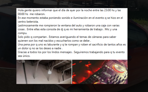 Delincuentes rompieron la ventana de su auto y se llevaron una caja con varios equipos esenciales para su trabajo, entre ellos una consola de DJ, un micrófono y una computadora.