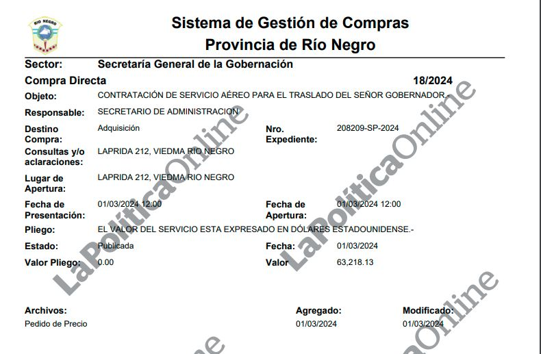 El gobernador contrató el 1 de marzo un jet privado por USD 63.218,13 para viajar desde Neuquén a Trelew, dos ciudades separadas por sólo 530 kilómetros.