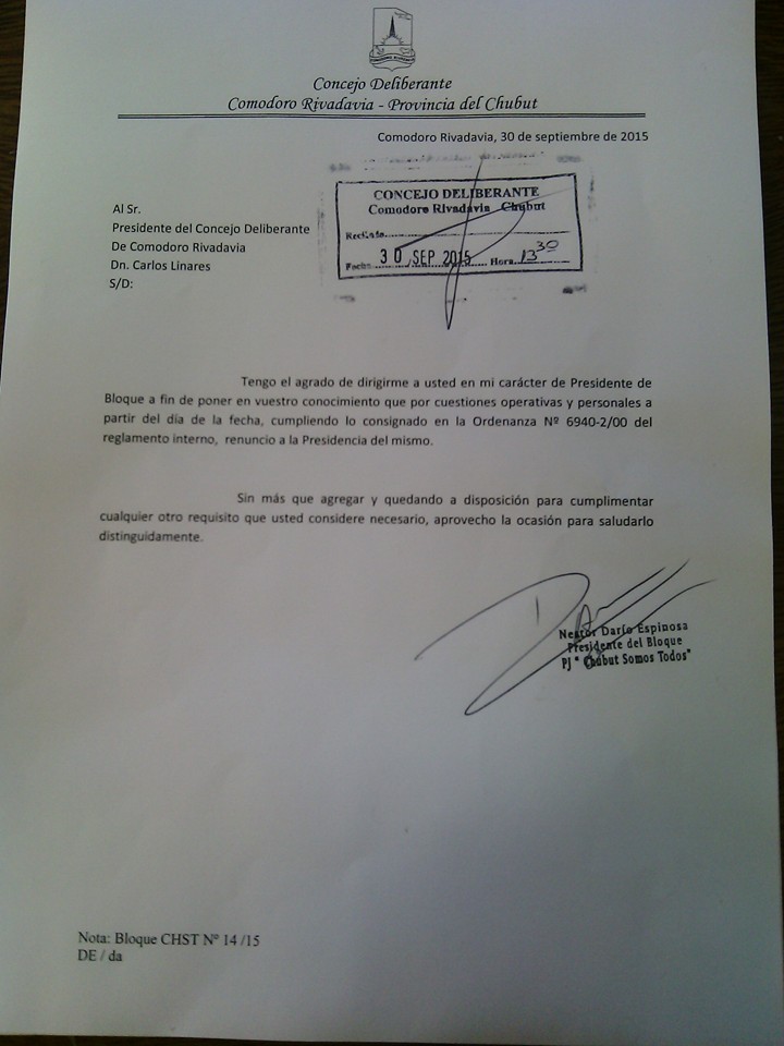 En horas de la tarde de ayer, el concejal por Chubut Somos Todos, Darío Espinosa, presentó su renuncia al cargo de presidente del bloque.