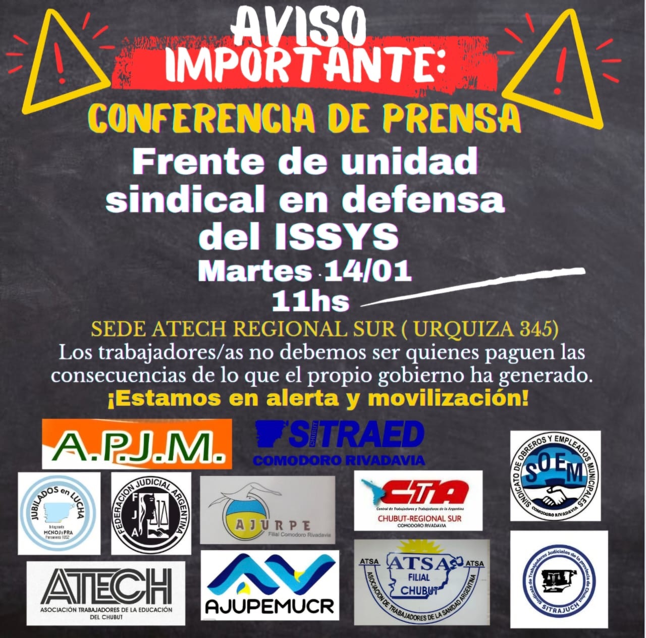 Por su parte, Daniel Murphy de ATECh, dijo que «es muy importante el encuentro de esta unidad, de los distintos sectores en defensa de nuestra caja de jubilaciones y nuestra obra social. Como venimos diciendo, no es de ningún Gobierno, es de los trabajadores, de nuestro familia, por eso exigimos el pago de esa deuda que mencionó Raúl, una que está por encima del billón de pesos».