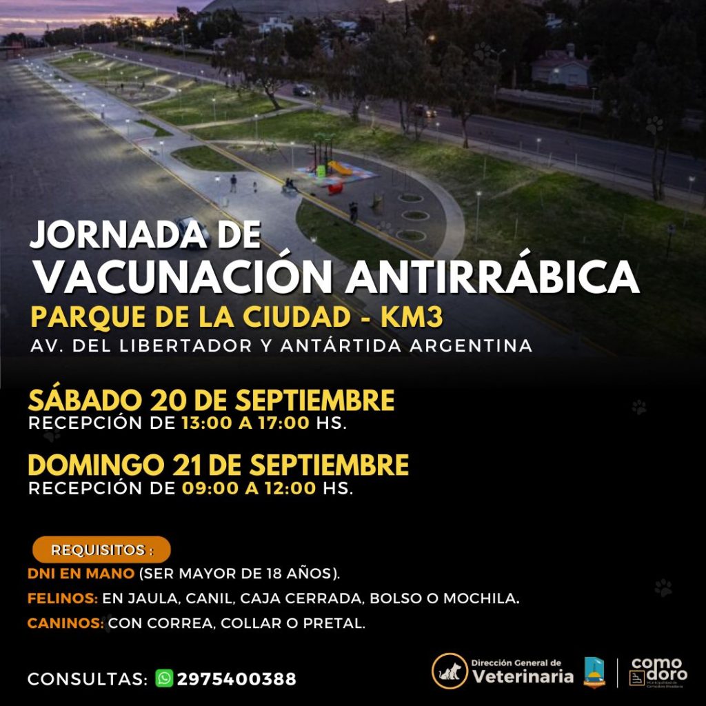 Este sábado 20 y domingo 21 de septiembre se llevará a cabo una jornada especial de vacunación antirrábica gratuita para perros y gatos en el Parque de la Ciudad, KM3 (Av. del Libertador y Antártida Argentina).