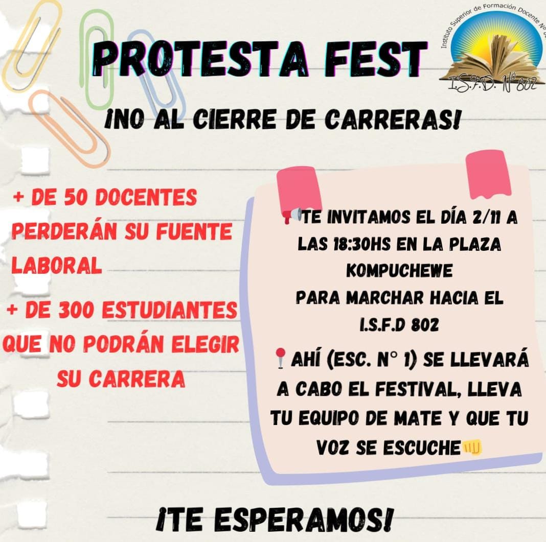 Finalmente, señaló que “nosotros como docentes nos autoconvocamos, no es una cuestión gremial ni nada por el estilo. Nos reunimos la semana pasada y nos vamos a movilizar este jueves 2 a partir de las 18 horas, en la plaza Kompuchewe hasta el Instituto donde terminamos con una actividad de manifestación”.