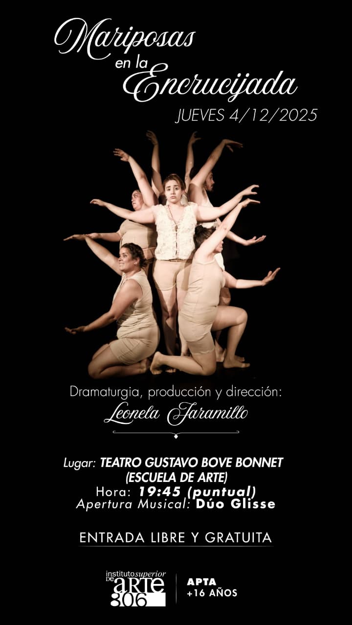 La obra de teatro «Mariposas en la Encrucijada» se estrena este jueves 4 de diciembre a las 19:45 en el Teatro Gustavo Bove Bonnet de la Escuela de Arte Clara Mizrahi, con entrada libre y gratuita.