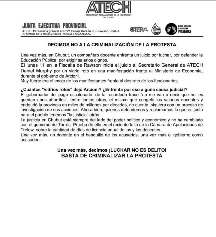 A través de un comunicado, el sindicato manifestó que “una vez más, en Chubut, un compañero docente enfrenta un juicio por luchar, por defender la Educación Pública, por exigir salarios dignos”.