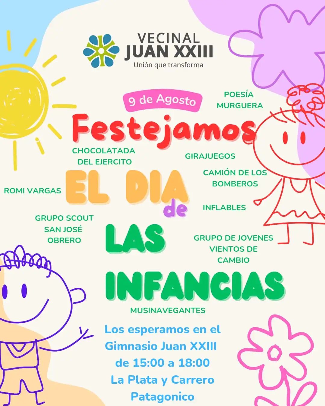 Este sábado, de 15 a 18 horas, el Gimnasio Juan XXIII, ubicado en La Plata y Carrero Patagónico, se transformará en un espacio de diversión y alegría para toda la familia con la celebración del Día de las Infancias.