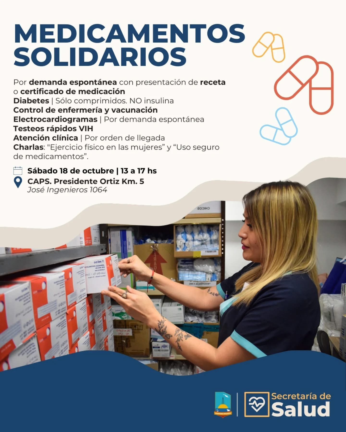 La Secretaría de Salud llevará adelante una nueva edición del programa “Medicamentos Solidarios”, este sábado 18 de octubre, de 13 a 17 horas, en el CAPS de Presidente Ortiz, ubicado en José Ingenieros 1064, Km. 5.