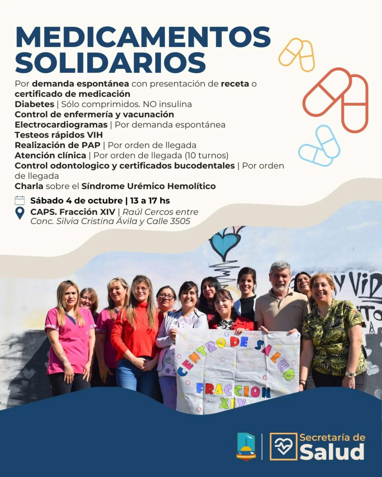 El próximo sábado 4 de octubre, de 13 a 17 hs, se realizará una jornada de medicamentos solidarios y atención sanitaria en el CAPS de la Fracción XIV, ubicado en Raúl Cercos entre Conc. Silvia Cristina Ávila y Calle 3505.