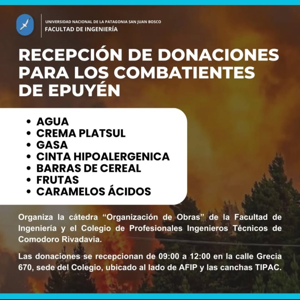 La Facultad de Ingeniería de la Universidad de la Patagonia San Juan Bosco y el Colegio de Profesionales Ingenieros Técnicos de Comodoro Rivadavia han lanzado una campaña solidaria para asistir a los bomberos que combaten el incendio forestal en Epuyén.