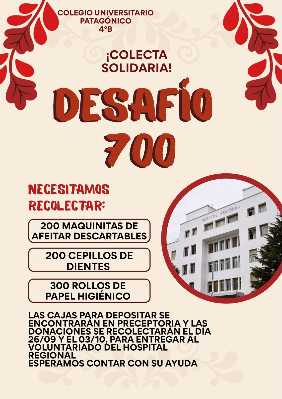 Las y los estudiantes de 4ºB en Humanidades del Colegio Universitario Patagónico se unieron a la Campaña solidaria organizada por el Voluntariado del Hospital Regional con el objetivo de recolectar insumos de higiene esenciales para el hospital.