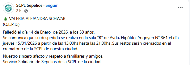 Desde la familia pidieron respeto y acompañamiento en este momento de duelo, mientras se concreta la despedida final de Valeria, rodeada del cariño de sus seres queridos.