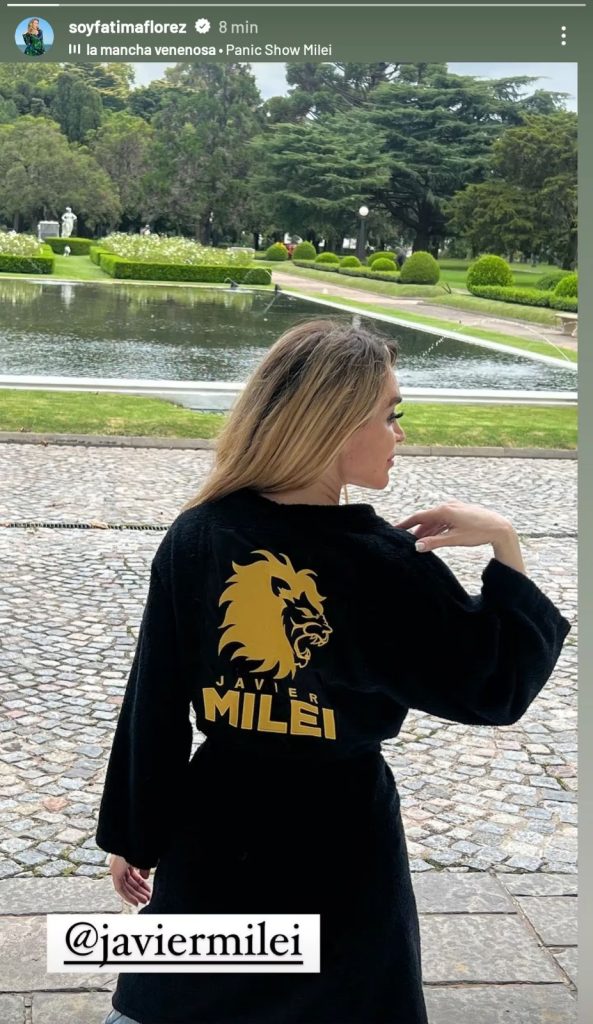 Fátima Florezcompartió este lunes por la mañana una foto desde la Quinta de Olivos. La imitadora publicó la postal en su perfil oficial de Instagram y se mostró con una bata negra que tiene bordado el nombre de Javier Milei y una imagen de un león.