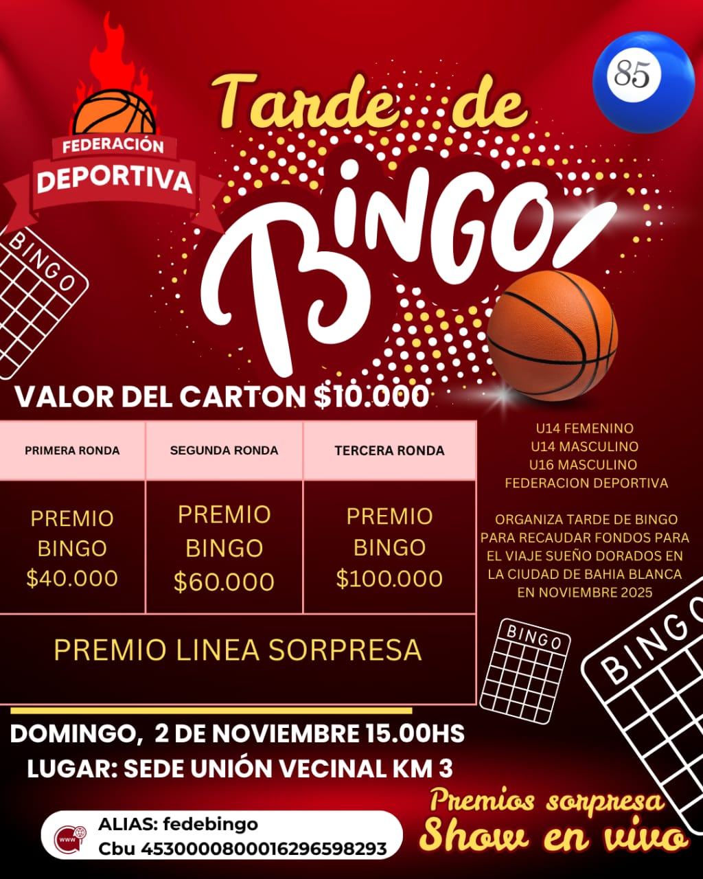 “El alias para las transferencias es FedeBingo, y en el flyer que estamos difundiendo figuran todos los datos. Todo aporte, por mínimo que sea, ayuda muchísimo para que los chicos puedan cumplir este sueño.”