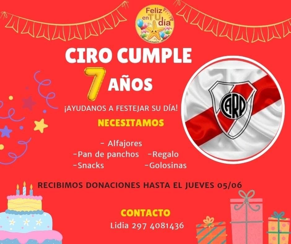 La propuesta es simple pero poderosa: ayudar con donaciones para que Ciro pueda tener su festejo soñado. Se necesita la colaboración de vecinos y vecinas con alimentos y artículos para la fiesta, entre ellos:
