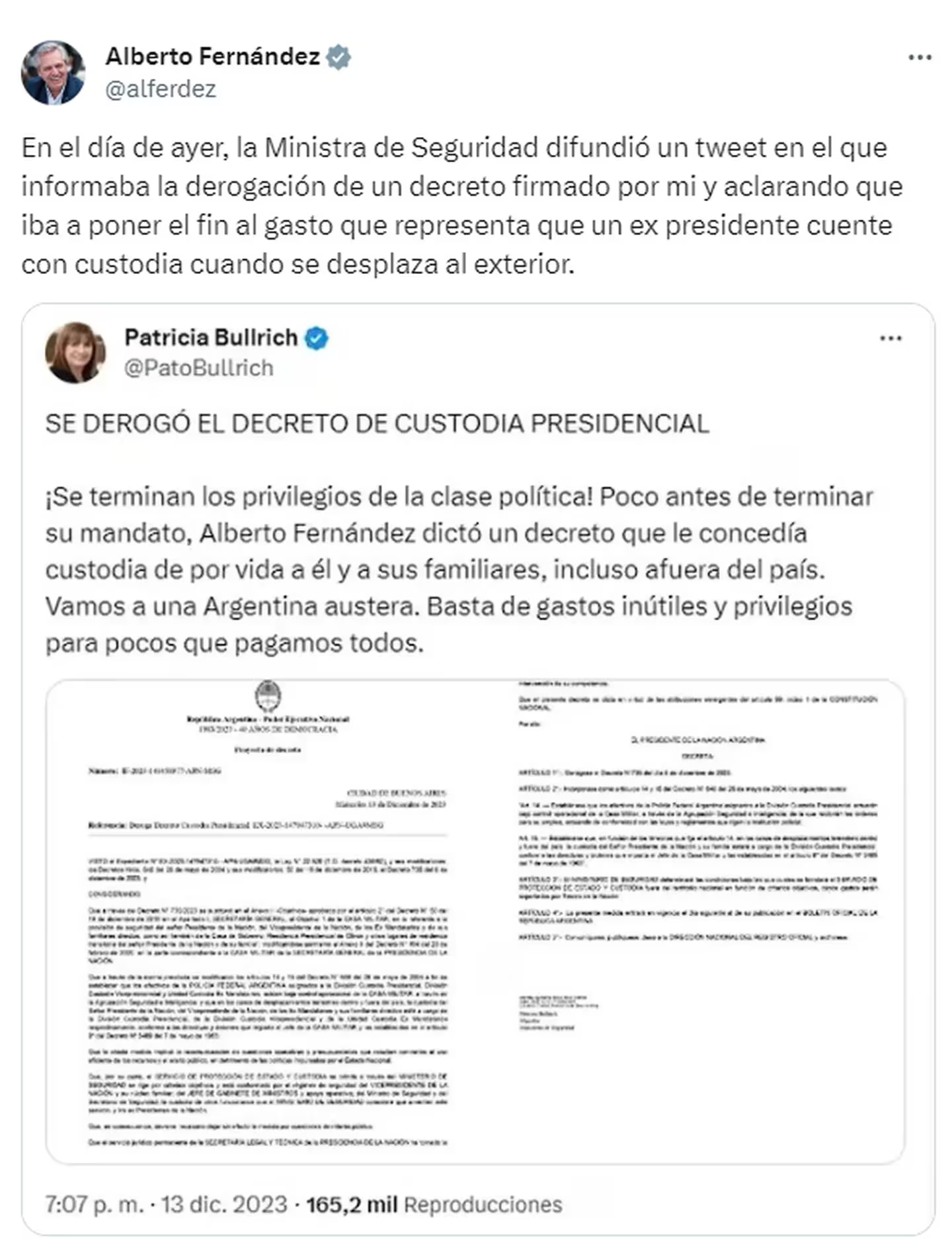En el día de ayer, la Ministra de Seguridad difundió un tuit en el que informaba la derogación de un decreto firmado por mí y aclarando que iba a poner el fin al gasto que representa que un expresidente cuente con custodia cuando se desplaza al exterior.