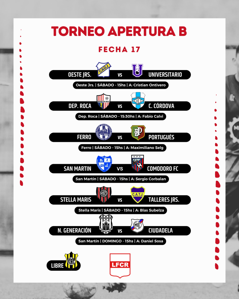 Media hora después de ese encuentro trascendental, Deportivo Roca recibirá a Caleta Córdova. El local viene gozando de una regularidad que le permitió estar al acecho de Rada, mientras que el Merlucero dio sobradas muestras de capacidad para dar pelea en el torneo, aunque viene un poco más relegado. El juez principal del encuentro será Fabio Calvi.