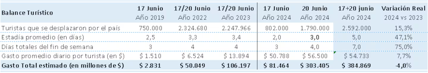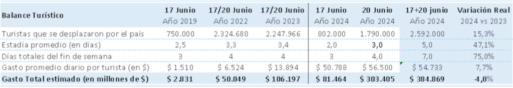 “Si se agregan los resultados de este fin de semana con los del feriado del pasado 17 de junio, al sumar siete días, casi 2,6 millones de personas salieron de paseo, esto es 15,3% más que en los cuatro días que duró el fin de semana combinado de 2023″, remarcó.