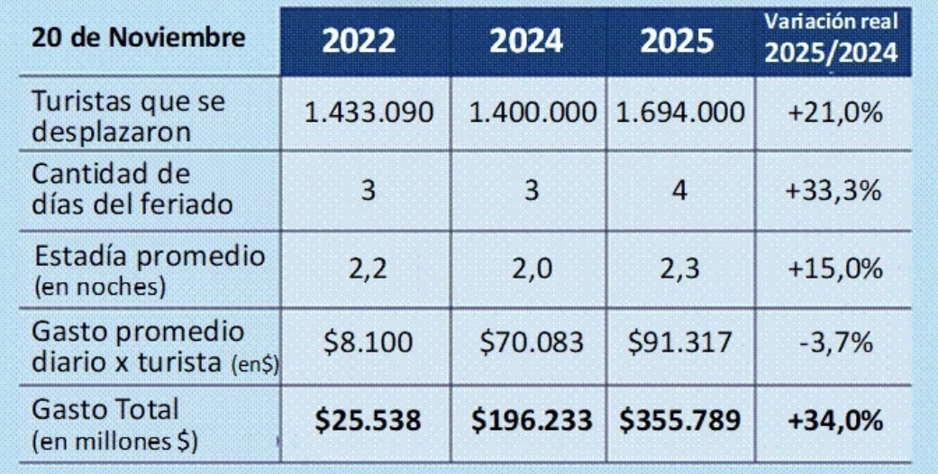 De acuerdo con el relevamiento de la Confederación Argentina de la Mediana Empresa (CAME), durante el fin de semana por el Día de la Soberanía Nacional se desplazaron 1.694.000 turistas por la Argentina, un 21% más que en el mismo feriado de 2024. El crecimiento se vio favorecido por la combinación de un clima templado, una agenda nacional muy activa y el formato de cuatro días, que amplió las posibilidades de viaje.