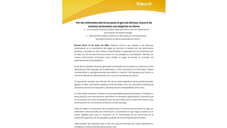 “Flybondi informa que debido a las demoras sistemáticas en la aprobación del pago de servicios al exterior por las restricciones pasadas y actuales se está viendo comprometida la capacidad de las aerolíneas para cumplir con los compromisos asumidos con sus pasajeros y proveedores. Además, los nuevos instrumentos financieros para facilitar el pago de deuda no cumplen las expectativas de los proveedores”, indicaron.