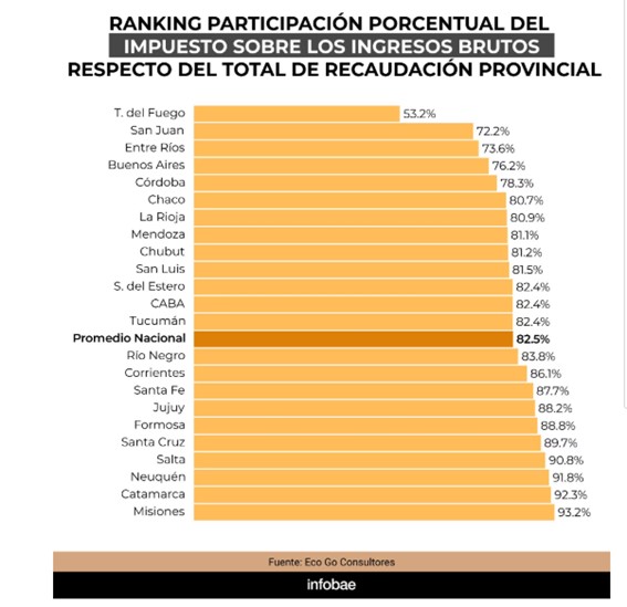 De acuerdo con un análisis de Eco Go, Ingresos Brutos representa, en promedio, el 82,5% de lo que recaudan las provincias de impuestos locales. El resto se distribuye entre el Automotor, el Inmobiliario, Sellos y otros ingresos.