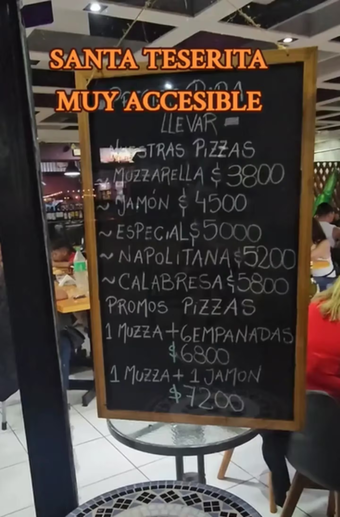 El video se publicó bajo el usuario @huevos.al.plato en la plataforma de Tiktok. “Vacacionar es accesible”, comentó. Lo primero que mostró fueron los precios de las pizzas. La grande muzzarella estaba a 3800 pesos, mientras que la más cara, que era la de calabresa, tenía un costo de $5800.