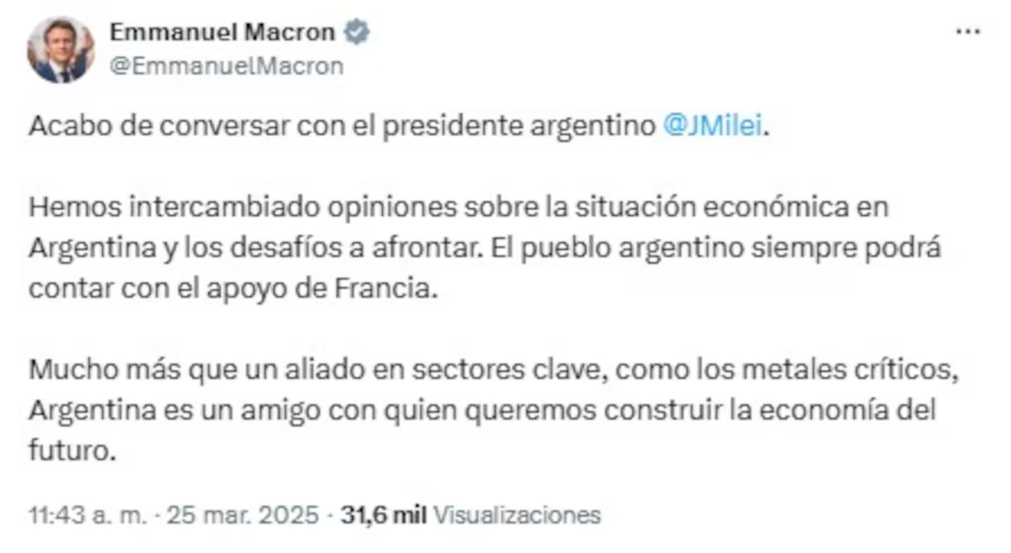 “Acabo de conversar con el presidente argentino. Hemos intercambiado opiniones sobre la situación económica en Argentina y los desafíos a afrontar”, escribió Macron en su cuenta personal de la red social X (exTwitter).