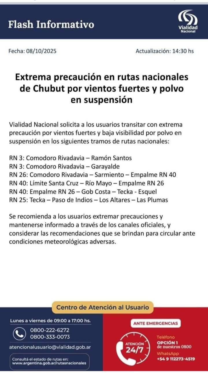La Dirección Nacional de Vialidad emitió un comunicado urgente para quienes transitan por las rutas patagónicas en Chubut, advirtiendo sobre condiciones climáticas adversas que afectan la visibilidad y seguridad vial.