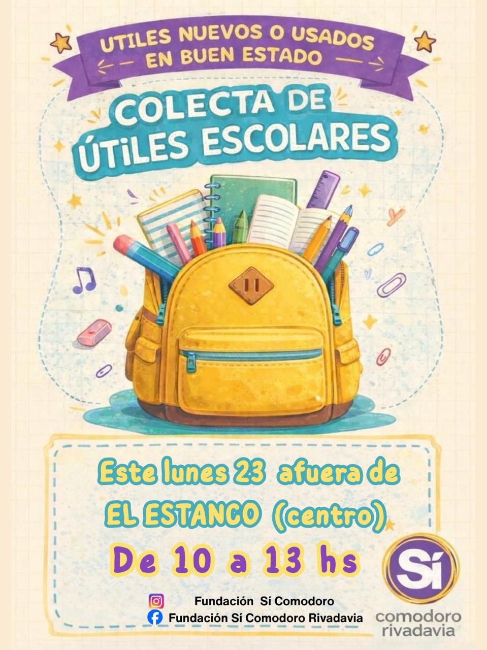 Este lunes 23 de febrero, la organización Fundación Sí Comodoro Rivadavia llevará adelante una colecta presencial de útiles escolares en la ciudad. La iniciativa tiene como propósito reunir artículos nuevos o usados en buenas condiciones.