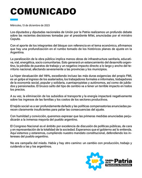 Tras la publicación de esa nota de prensa que lleva la firma del bloque que comanda Germán Martínez, Adorni expresó: “Nos sorprenden algunas reacciones particularmente de algún sector de la política, con un grado de responsabilidad en esta Argentina que estamos transitando. Mientras que muchos guardaron silencio ante inflación descontrolada, salarios magros, creación de pobres como nunca, hoy nos cuestionan por las medidas y por el camino que estamos tomando, cuando lo único que estamos haciendo es evitar la catástrofe que ellos mismos propiciaron y colaboraron a crear”.