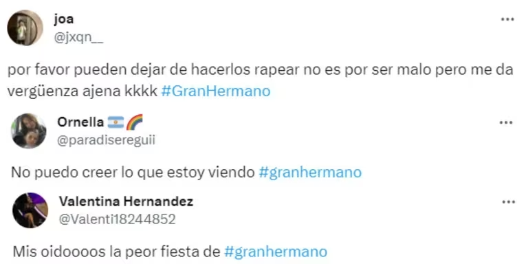 En tanto, también fueron contundentes en general y hasta despreciaron la fiesta de esta semana: “Ya cansaron un poco (bastante) con el rap”; “qué estamos viendo por Dios”; “mis oídos, la peor fiesta de Gran Hermano”, agregaron otros usuarios, mientras que algunos simplemente dejaron una imagen alusiva.