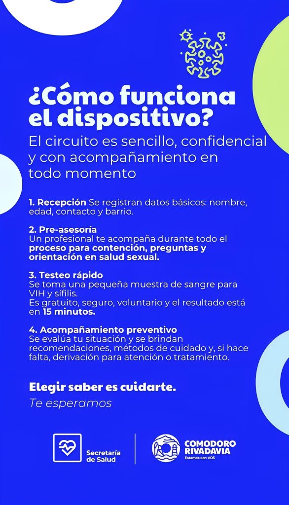 La Secretaría de Salud local puso en marcha un «espacio de prevención combinada de VIH e ITS» (Infecciones de Transmisión Sexual), invitando a la comunidad a acercarse para realizar consultas y chequeos de manera simple y segura.