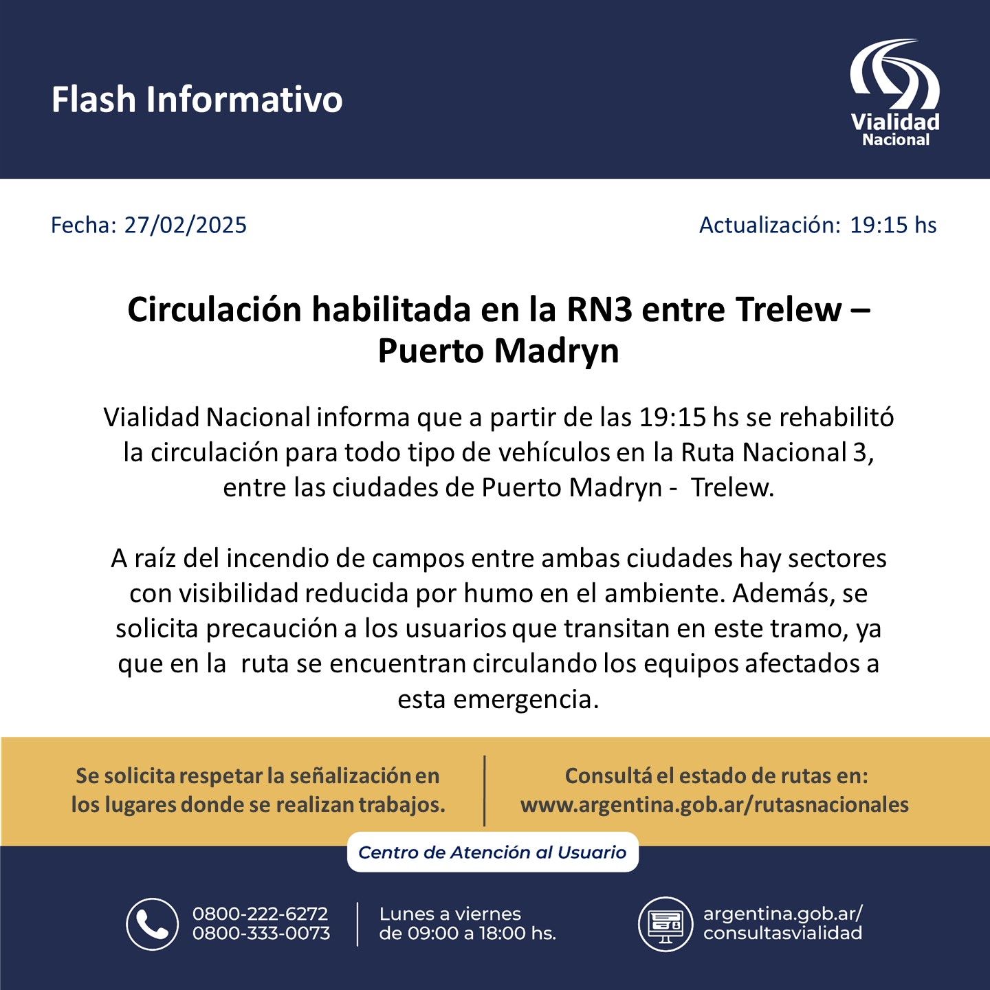 Vialidad Nacional informó que a partir de las 19:15 hs se rehabilitó la circulación para todo tipo de vehículos en la Ruta Nacional 3, entre las ciudades de Puerto Madryn – Trelew.