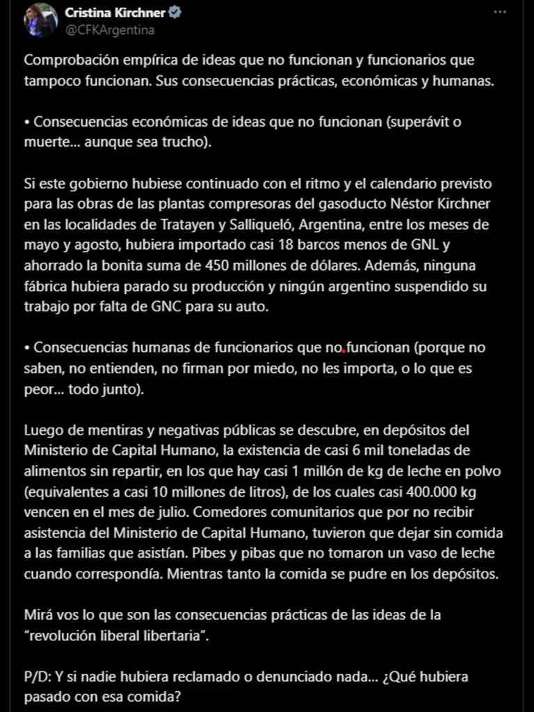 La ex vicepresidenta también aprovechó su aparición en rede sociales para expresarse sobre el escándalo que se desató en el Ministerio de Desarrollo Social por el reparto de alimentos: “Comprobación empírica de ideas que no funcionan y funcionarios que tampoco funcionan. Sus consecuencias prácticas, económicas y humanas. Si este gobierno hubiese continuado con el ritmo y el calendario previsto para las obras de las plantas compresoras del gasoducto Néstor Kirchner en las localidades de Tratayen y Salliqueló, Argentina, entre los meses de mayo y agosto, hubiera importado casi 18 barcos menos de GNL y ahorrado la bonita suma de 450 millones de dólares. Además, ninguna fábrica hubiera parado su producción y ningún argentino suspendido su trabajo por falta de GNC para su auto”.