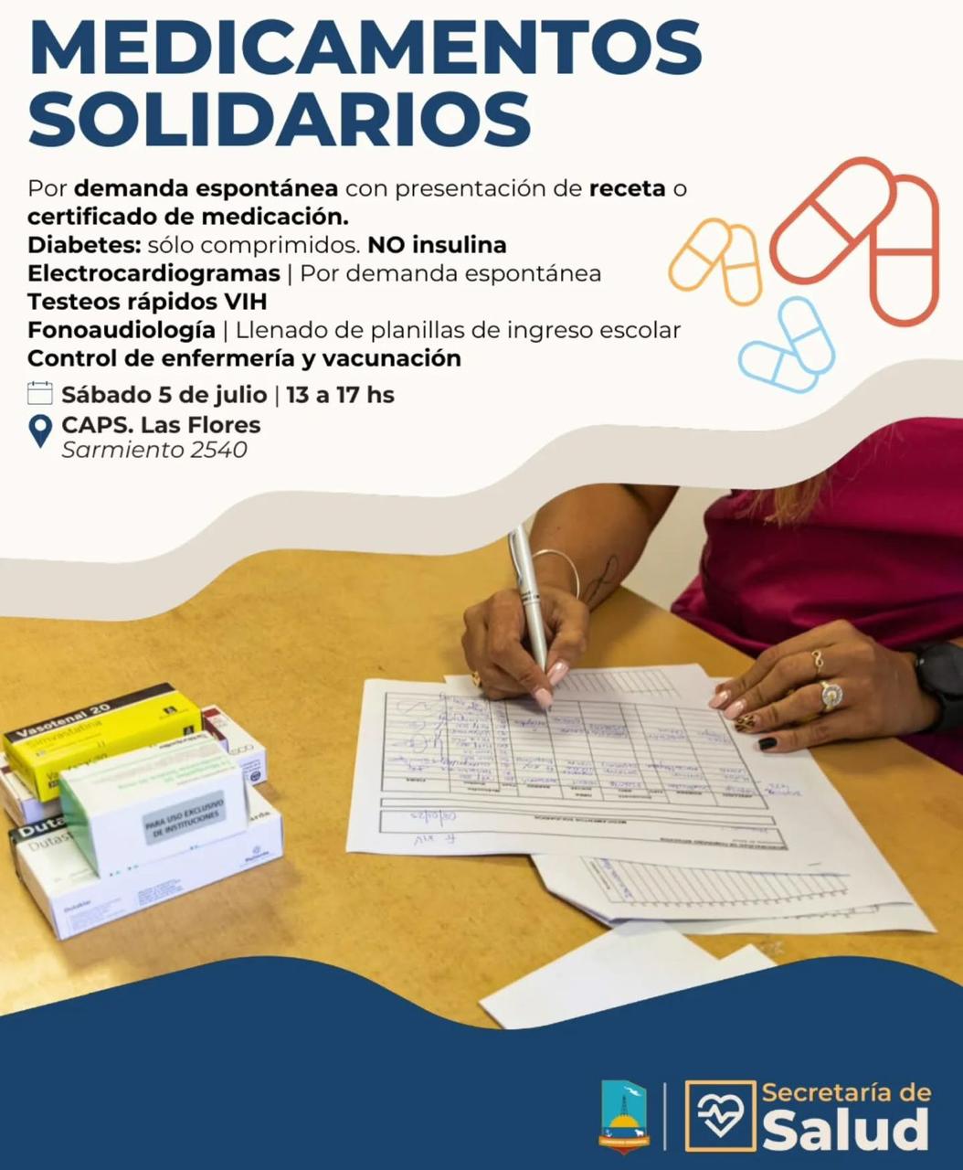 La Secretaría de Salud municipal llevará adelante este sábado 5 de julio una jornada de atención integral en el CAPS del barrio Las Flores, ubicado en Sarmiento 2540. La actividad se desarrollará de 13 a 17 horas y está destinada a personas que necesiten acceder a medicamentos o distintos controles de salud de manera gratuita.