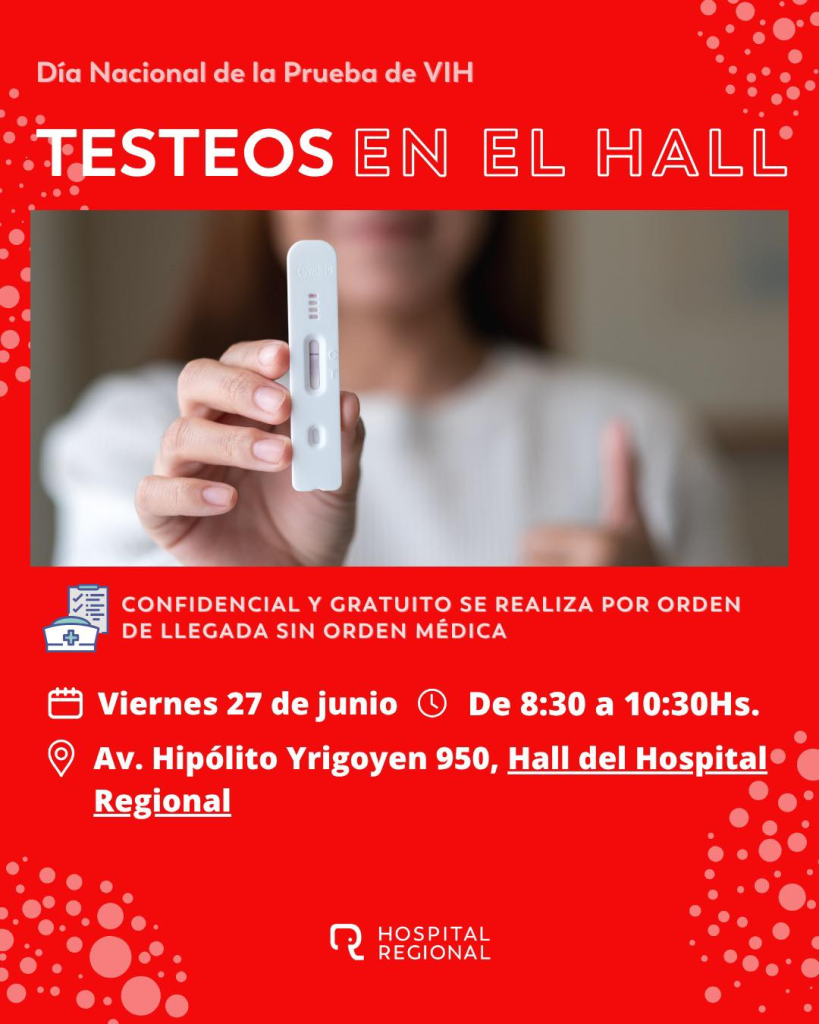La actividad se realizará este viernes 27 de junio, de 8:30 a 10:30 hs, en el hall central del Hospital. Allí se realizarán test de VIH de manera gratuita, confidencial y sin necesidad de orden médica.