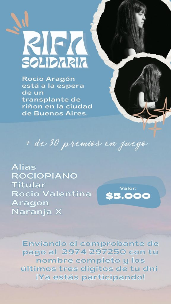 Quienes deseen colaborar pueden hacerlo a través del alias: RocíoPiano, o comunicándose al 297 433 3563, donde se envía el comprobante de pago para participar de la rifa. El sorteo se realizará una vez que se vendan todos los números, y la fecha será informada a través de las redes sociales.