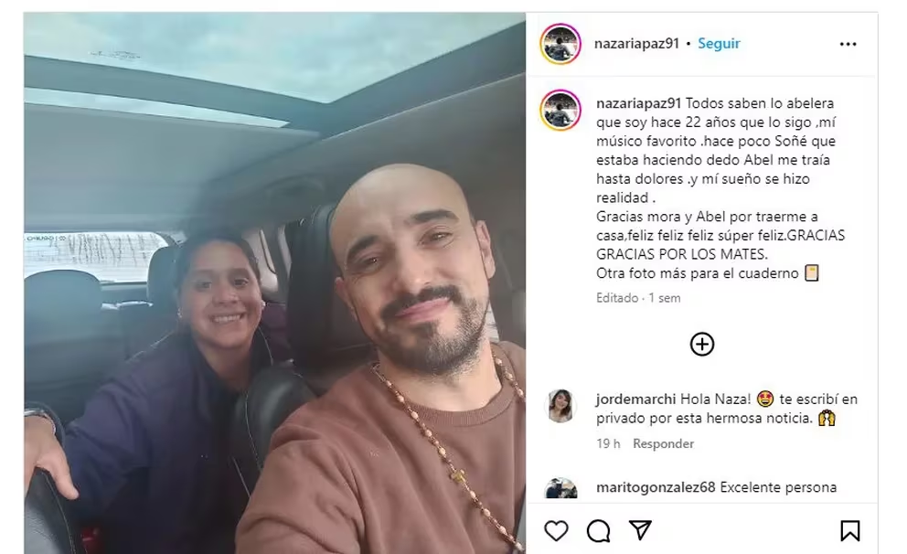 Lo que hace este encuentro aún más sorprendente es que Nazaria había tenido un sueño similar dos semanas antes de que se hiciera realidad. “Todos saben lo abelera que soy. Lo sigo hace 22 años y es mi músico favorito. Hace poco soñé que estaba haciendo dedo y Abel me traía hasta Dolores. Hoy mi sueño se hizo realidad. Gracias Mora y Abel por traerme a casa. Estoy feliz, súper feliz. Gracias por los mates”, escribió la chica en sus redes sociales. Además, compartió en Instagram la foto que se sacó en el auto de su ídolo.