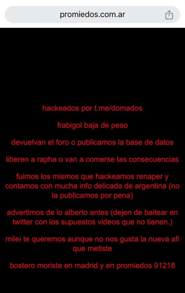 Los autores del hackeo se identificaron como los “t.me/domados”. El grupo se adjudicó haber intervenido en la web del Renaper y han asegurado que cuentan con “mucha info delicada de Argentina”. También, aseguran, advertieron lo que iba a suceder con los supuestos vídeos que involucran a Alberto Fernández en su causa de violencia de género con Fabiola Yañez.