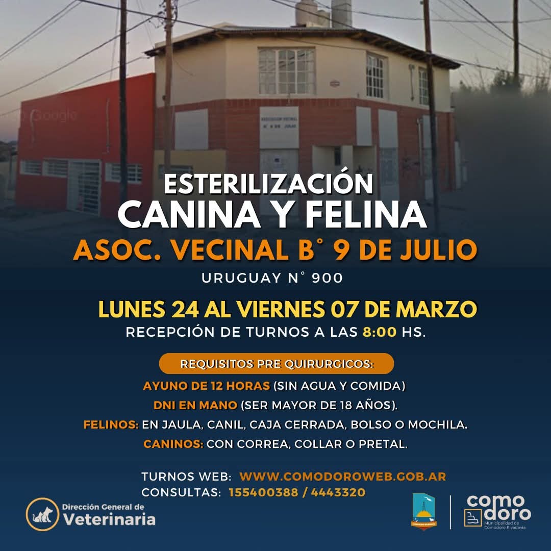 Desde Perros Sanos indicaron que el punto de esterilización canina y felina estará en la Vecinal del barrio 9 de julio hasta el viernes 7 de marzo.