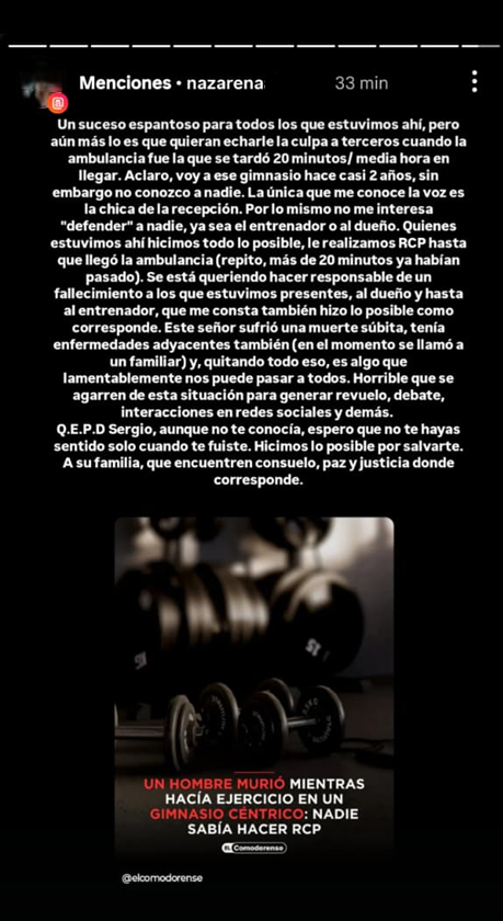 «Quienes estuvimos ahí hicimos todo lo posible, le realizamos RCP hasta que llegó la ambulancia, repito, más de 20 minutos habían pasado», dijo la joven en sus redes.