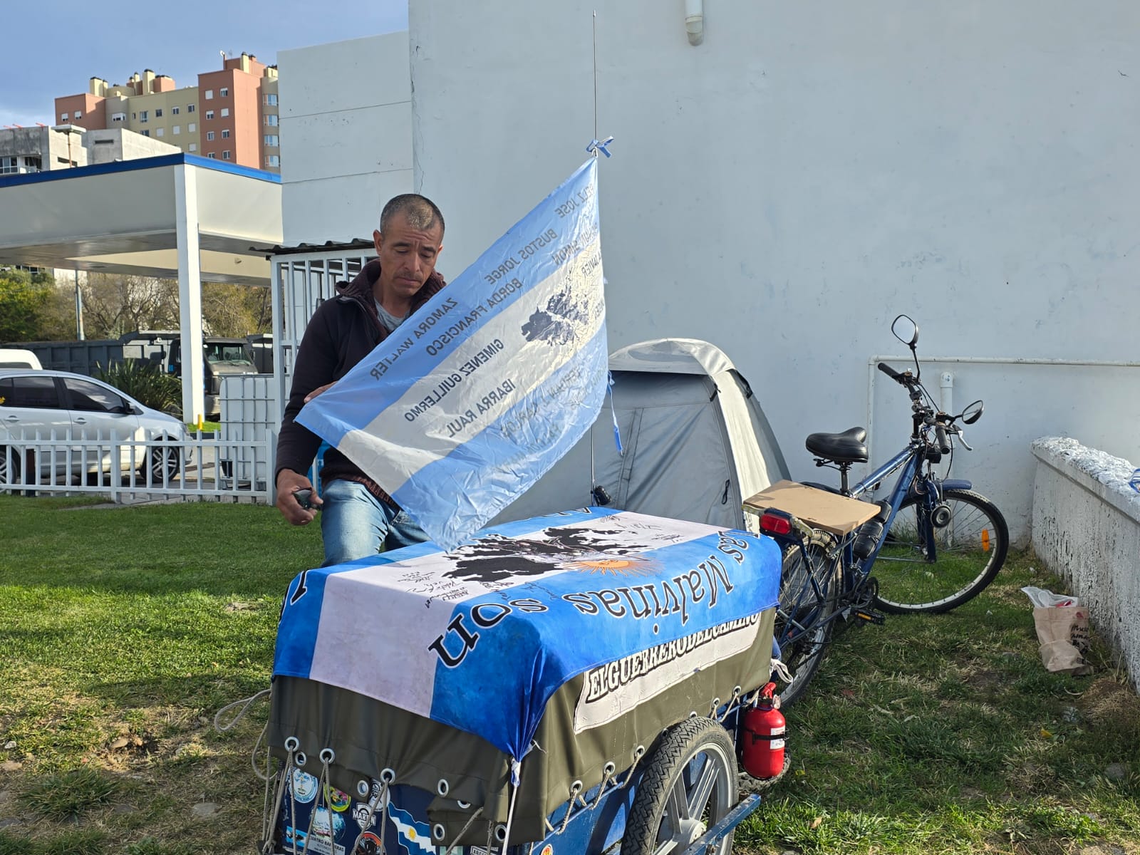 En su carro, armado por él mismo, contó que tiene «la bandera con los excombatientes que volvieron con vida de Zapala, y también esta otra que son los de Sarmiento, me la regalaron los veteranos que viven allá».